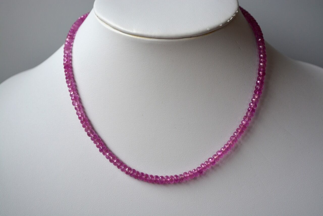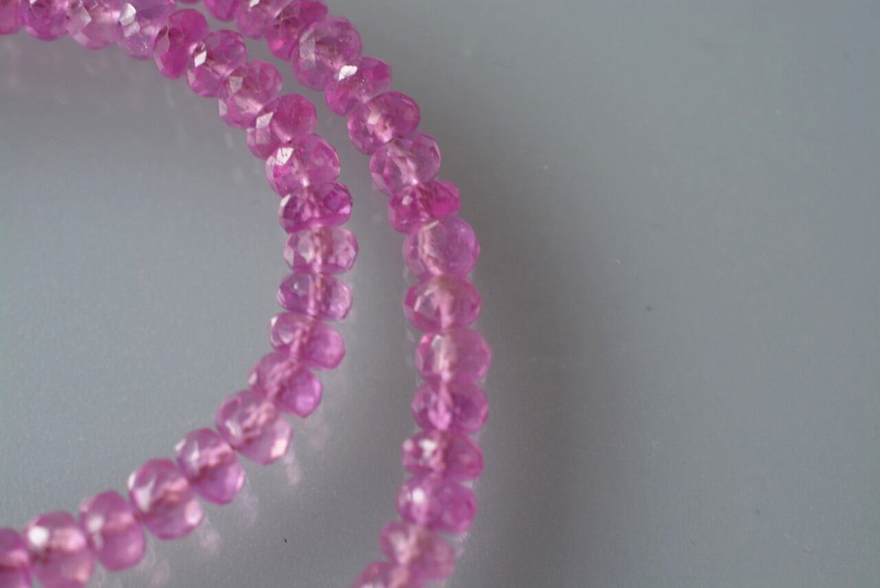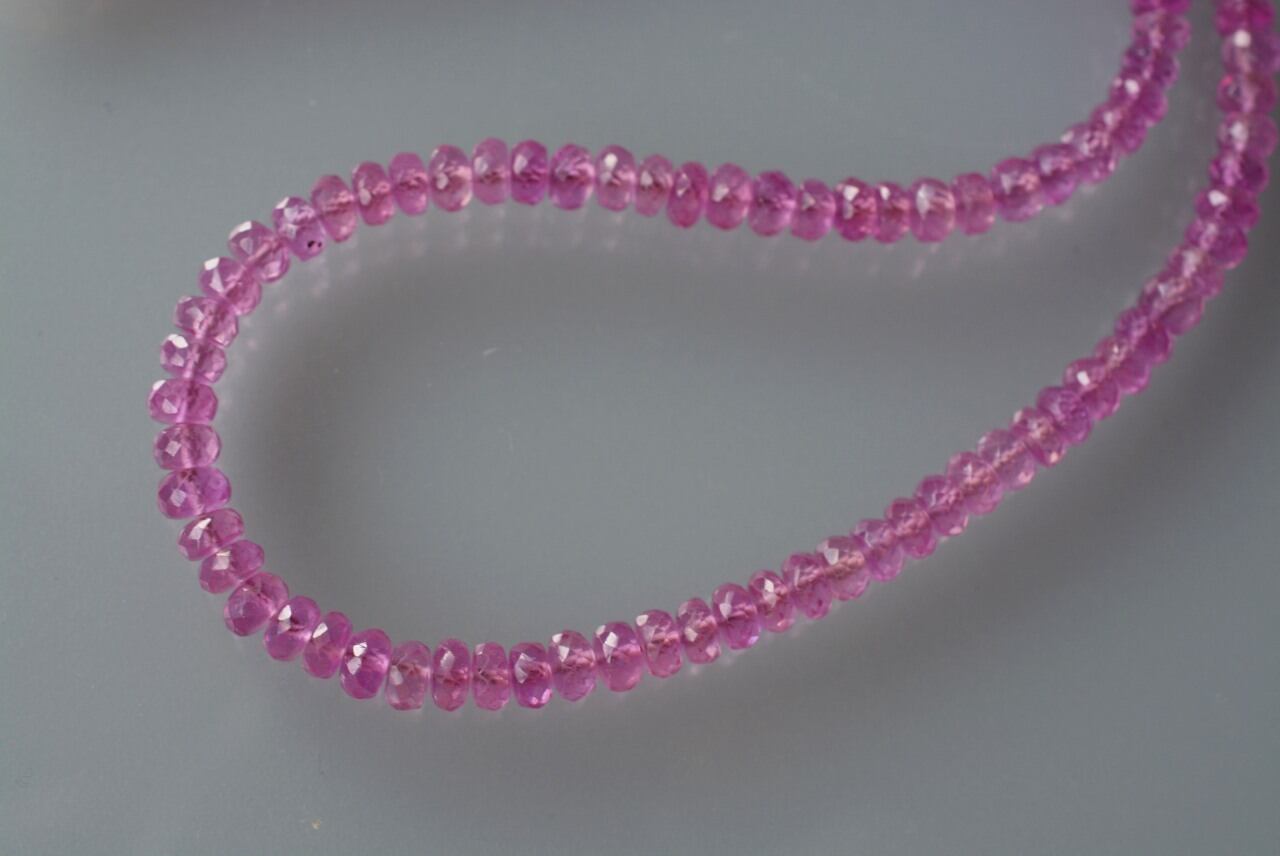 深みのあるピンクが印象的なピンクサファイアのボタンカットネックレスです。石のサイズは4ミリから4.5ミリ程度です。