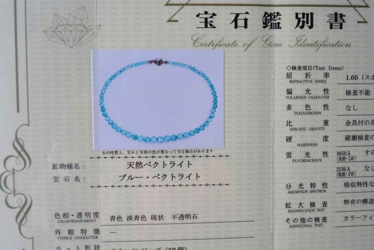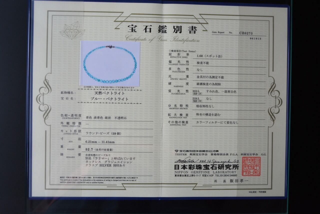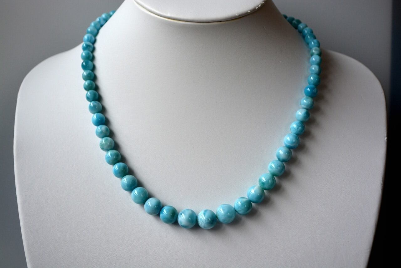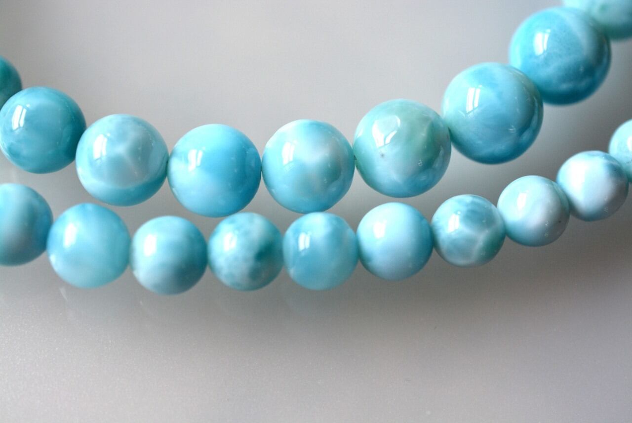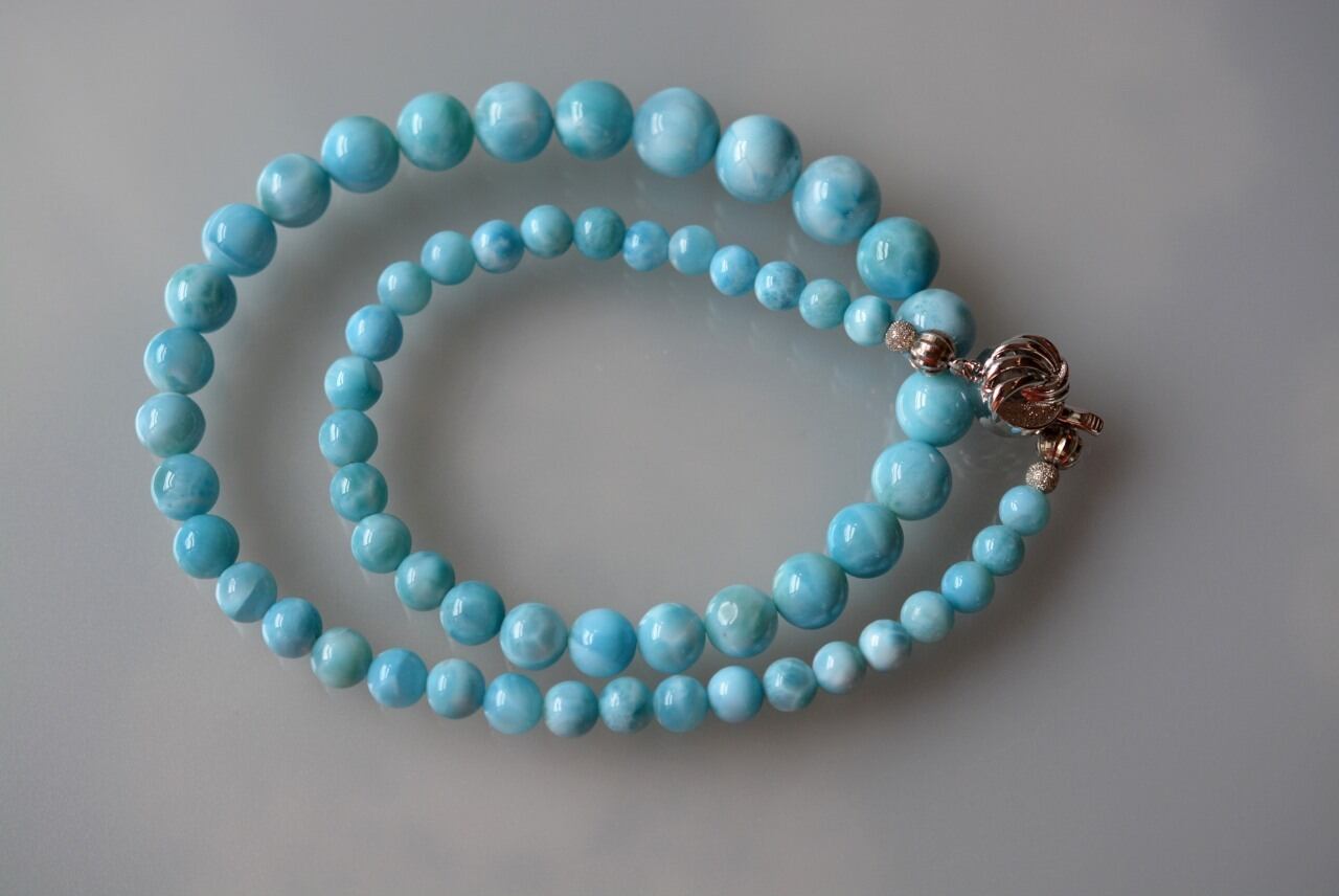 ヒーリングストーンとして人気のカリブの宝石ラリマー(ブルーペクトライト)のラウンド型ネックレスです。石のサイズは6.2ミリから11.4ミリで発色が良いラリマーです。